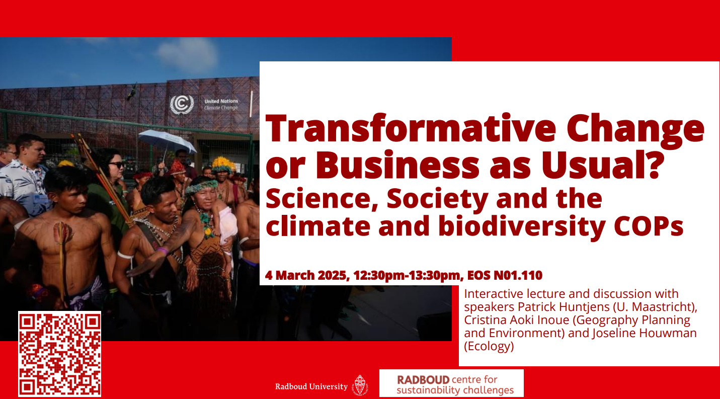 Speakers: Patrick Huntjens (Professor of Governance and Sustainability Transitions, Maastricht University), Cristina Y.A. Inoue (Environmental Policy and Governance, Faculty of Management), Joseline Houwman (Ecology, Faculty of Science)